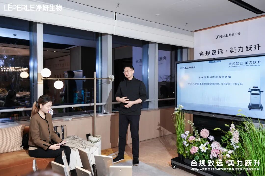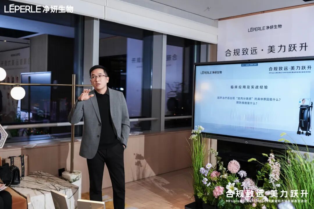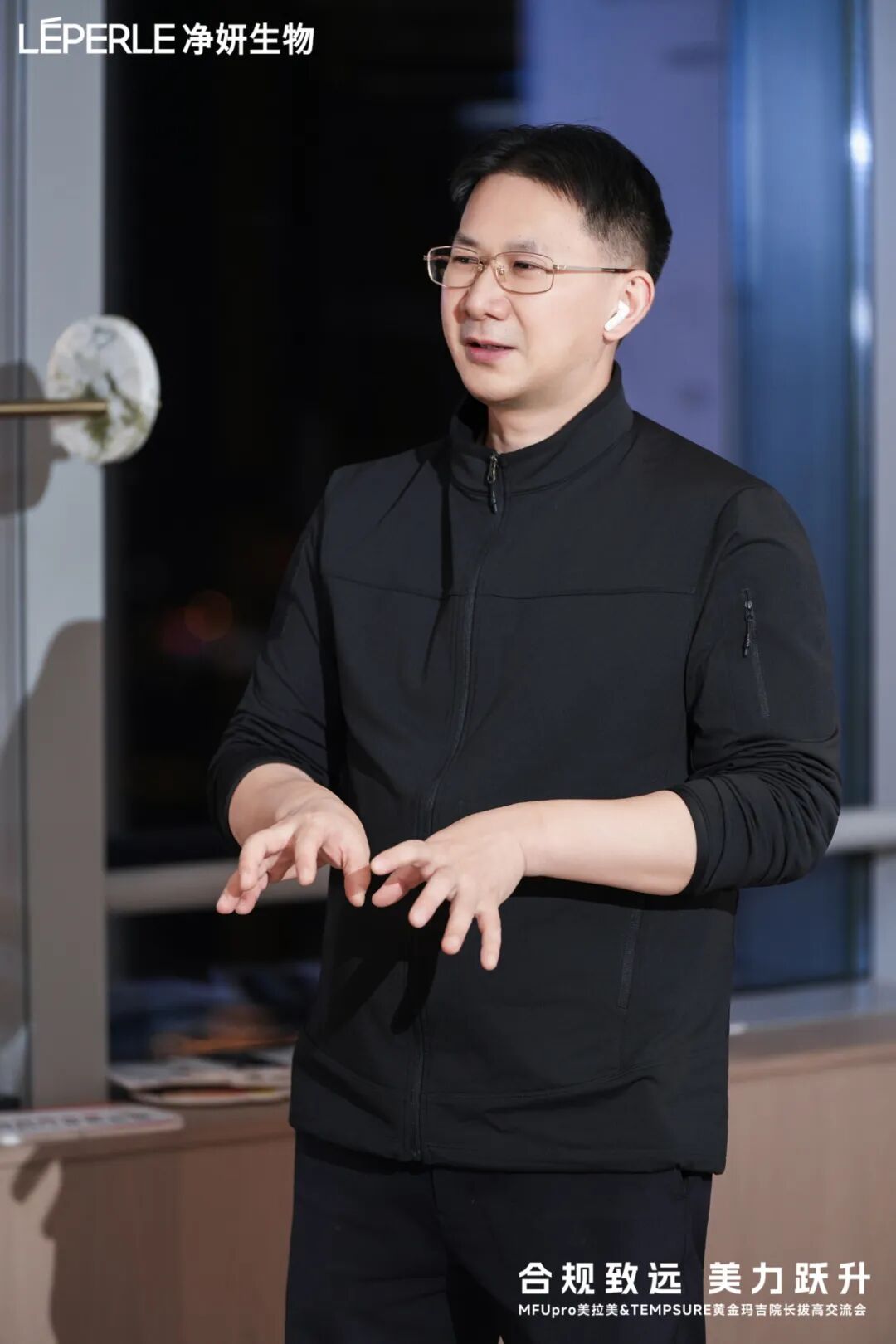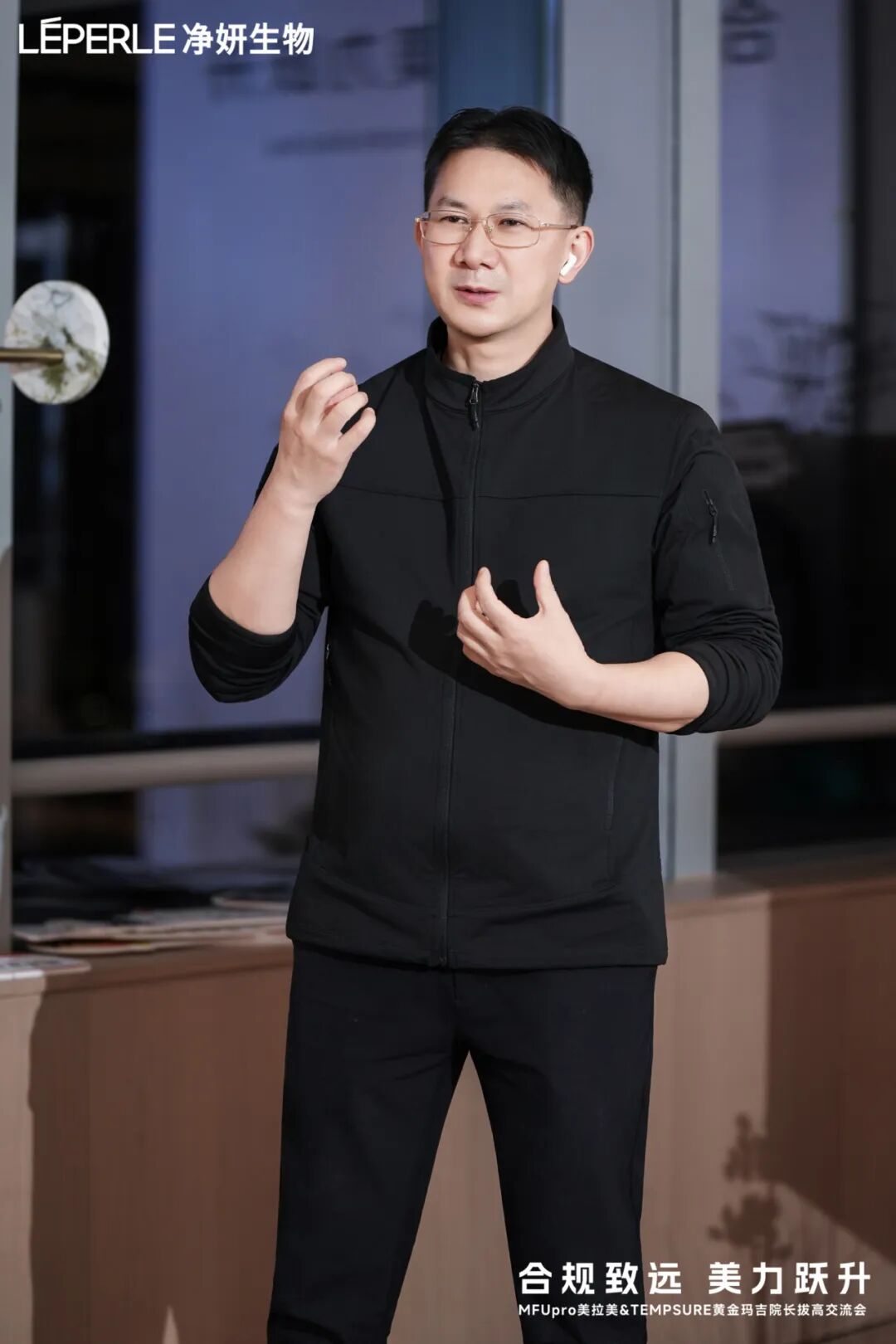 接着,长沙美莱刘翔作为净妍生物战略专家登台致辞。他表示:“当前,声光电抗衰技术快速发展,但市场乱象也随之而来——产品良莠不齐、操作边界不清、超适应症使用频发,严重威胁求美者安全和行业公信力。在此背景下,净妍生物坚持‘合规为先、临床为本’,联合多位权威专家举办院长交流会,推动行业规范发展,践行企业责任。作为临床一线的引领者,我们也应身负守护医美本质、保障求美者安全的使命。唯有坚守合规底线,才能真正实现从‘有产品’到‘用得好、用得安全、用得规范’的高质量跃升。”